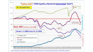 El transporte ferroviario de mercancías ha experimentado una fuerte caída en el ejercicio 2024, situándose en apenas un 85,11% del volumen registrado en el año 2000, según refleja el último Índice de Comodalidad -medido en toneladas x kilómetro-, realizado por UOTC. En 2024 se transportaron por tren 2.689,5 millones de mercancías x km recorrido (tanto Renfe Mercancías como operadores privados) en España, lo que supone un 19,88% menos que en 2023 y un 14,89% menos que en el primer trimestre del año 2000 (cuando en nuestro país sólo operaba Renfe Mercancías).